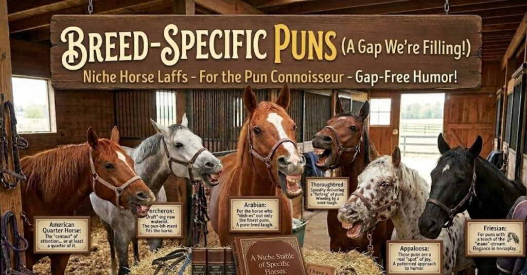 Breed-specific horse puns use the unique names and stereotyped traits of distinct horse breeds — such as Thoroughbreds, Mustangs, Clydesdales, and Arabians — to create niche wordplay that resonates especially with equestrians and horse enthusiasts. Different breeds, different personalities, different punchlines:
