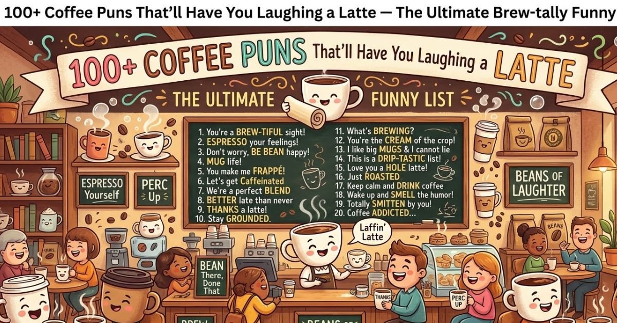 Looking for the best coffee puns to make people laugh a latte? You’re in the right place. Whether you need funny captions, flirty lines, or clever barista jokes, this ultimate list of coffee puns will instantly perk up your mood you know that feeling when you take your first sip of coffee in the morning and suddenly boom, you’re a functioning human again? Yeah. That’s exactly what a good pun does to a boring conversation.